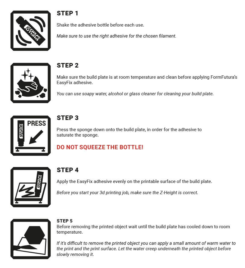 EasyFix adhesives are engineered to glue firmly to a heated build plate, making an object stick firmly to the build plate. On the other hand it also has excellent release properties when the build plate is cold. This makes it very easy to remove a printed object from the build plate while reducing the risk of damaging the build plate and printed object in the process.
