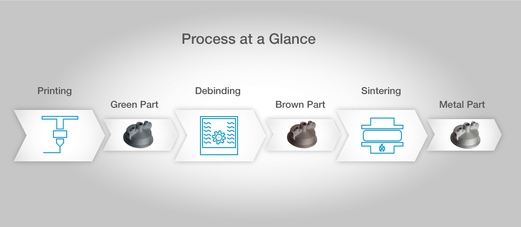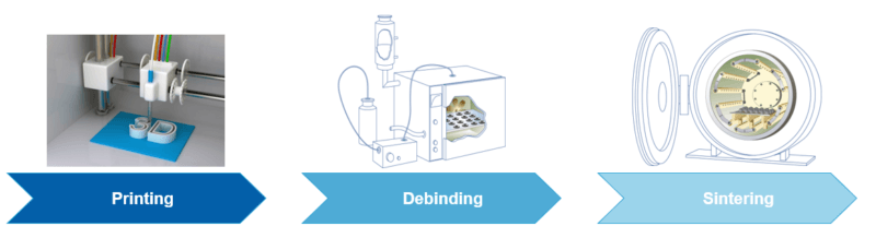 As peças impressas com o nosso filamento composto de metal-polímero 17-4 PH Ultrafuse recebem as suas propriedades finais através de um processo de rebarbagem e sinterização catalítico familiarizado com a moldagem tradicional por injecção de metal.