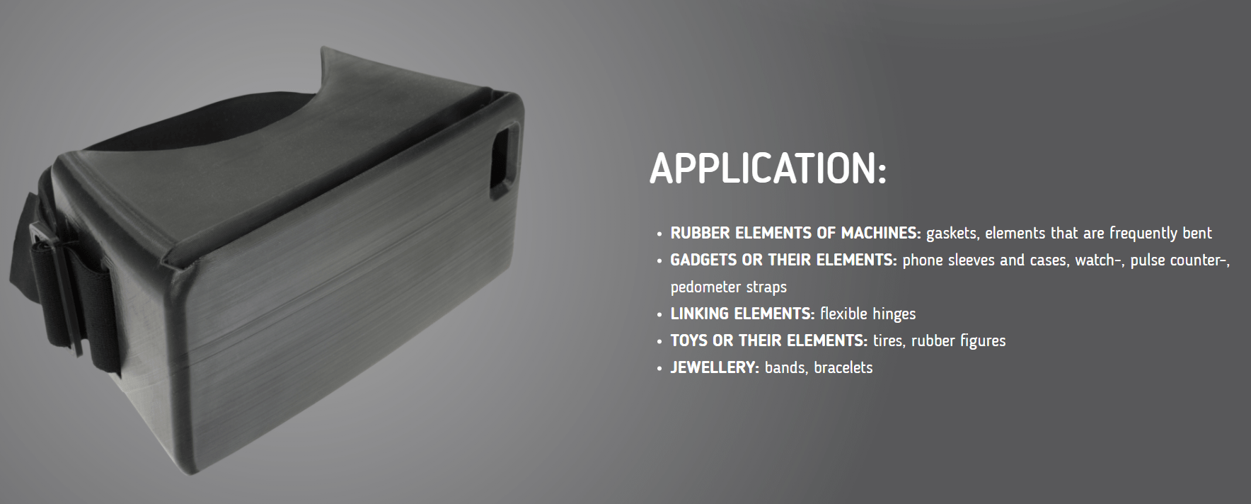 Um elastómero termoplástico com uma dureza de 40D na escala shore, que pode ser impresso a velocidades até 45 mm/s. O material em forma de borracha pode ser estendido até 680% das suas dimensões originais. Além disso, tem uma alta resistência ao impacto a baixas temperaturas e é resistente à abrasão e tem uma resistência química muito boa. Todas as propriedades materiais dão a oportunidade de usá-lo em lugares que requerem dobragem frequente, em gadgets, bem como partes de borracha de máquinas e elementos de união.