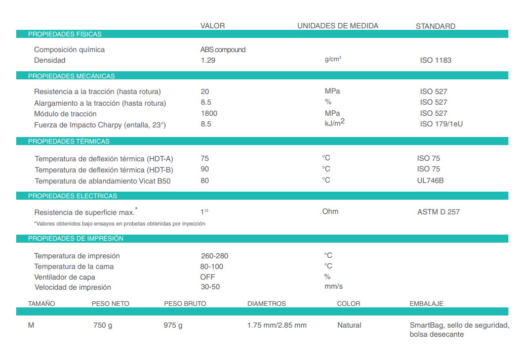 Esta propriedade torna este material especialmente adequado para a indústria alimentar, onde a ausência de contaminantes de qualquer origem é essencial. Também é indicado para fabricação de sensores, embalagens inteligentes, etc. Além disso, este filamento possui alta estabilidade dimensional. Material muito rígido, com resistência química à abrasão. Resistente à umidade, fungos e mofo.