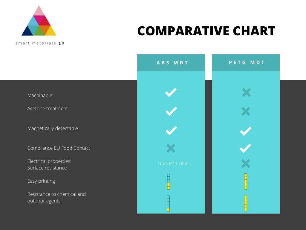 Ao contrário dos filamentos existentes no mercado reforçados com pós ferromagnéticos, o MDT ABS é detetável por todos os detetores de metal disponíveis no mercado, tanto através de ímã permanente quanto com os mais modernos com bobinas balanceadas. A sua composição não requer o uso de fibras de aço ou pós metálicos, e não contém fibras de carbono, grafite ou negro de carvão.