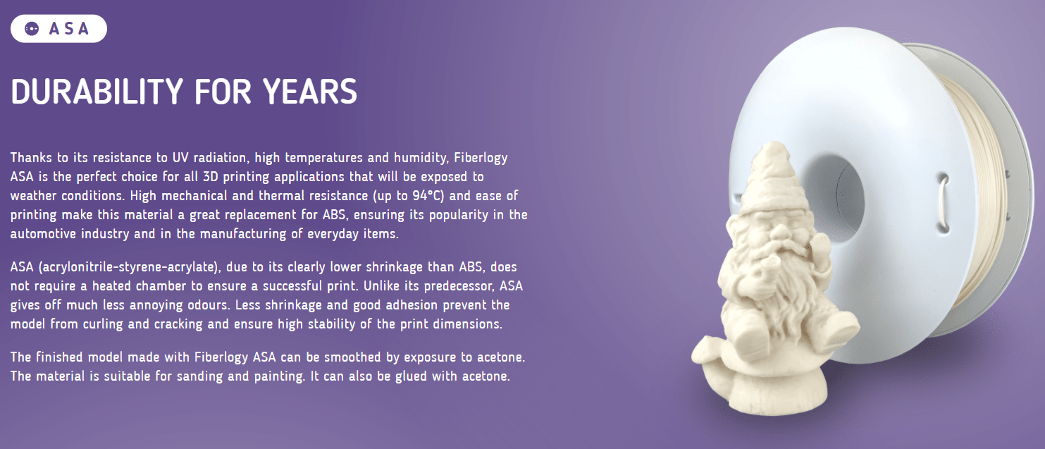 Graças à sua resistência à radiação UV, altas temperaturas e humidade, o ASA é a escolha perfeita para todas as aplicações de impressão 3D que serão expostas às condições climáticas.