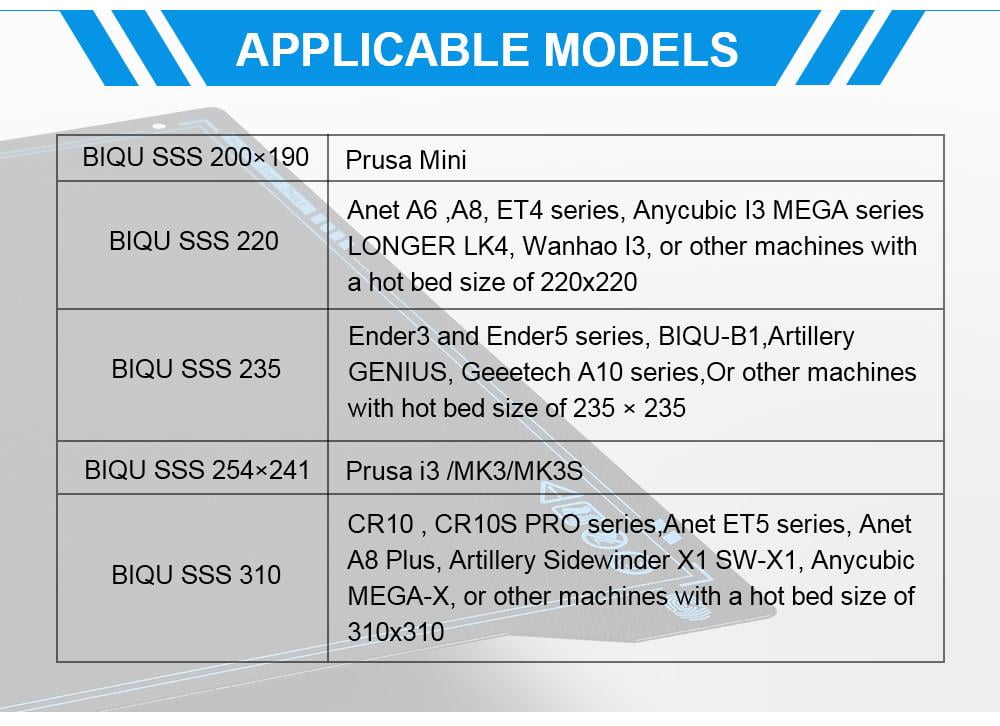 Ender 3, Anet A6 , A8, ET4 series, Anycubic 13 MEGA series LONGER LK4, Wanhao 13, or other machines with a hot bed size of 220×220 |