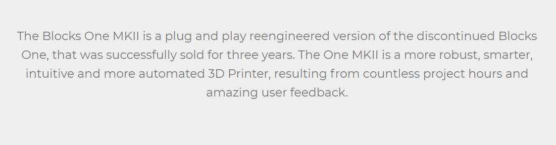 O BLOCKS ONE MKII é uma versão plug and play redesenhada da já descontinuada BLOCKS ONE, que foi vendida com sucesso durante três anos. O One MKII é uma impressora 3D mais robusta, mais inteligente, intuitiva e mais automatizada, resultante de inúmeras horas de projecto e de um feedback surpreendente dos utilizadores.