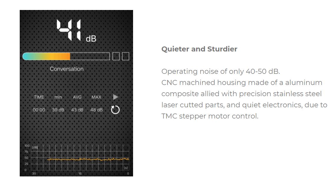 Ruído de funcionamento de apenas 40-50 dB. Caixa maquinada CNC feita de um composto de alumínio aliado a peças cortadas a laser de precisão em aço inoxidável, e electrónica silenciosa, devido ao controlo do motor passo-a-passo TMC.