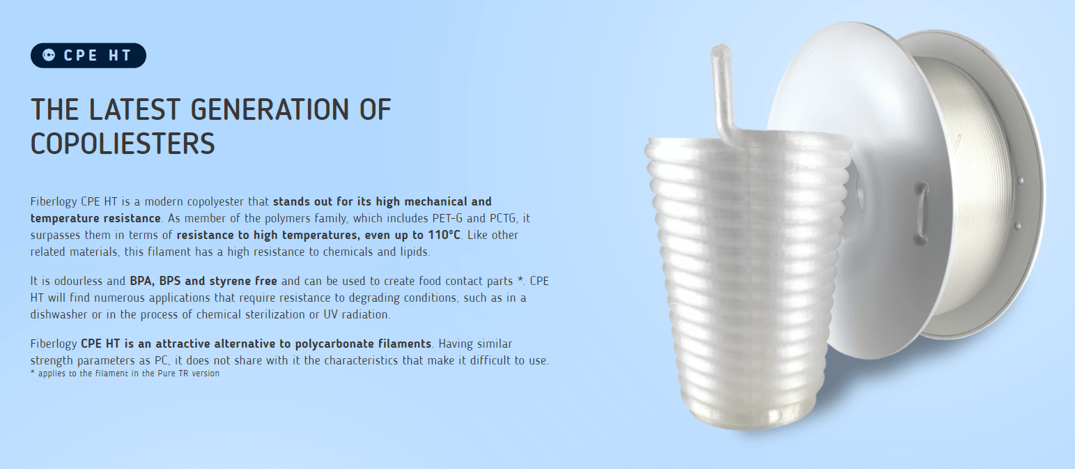 O CPE HT da marca Fiberlogy é uma alternativa atraente face aos filamentos de policarbonato (PC). Tendo parâmetros de resistência semelhantes aos do PC, não partilha com ele as características que dificultam a sua utilização.