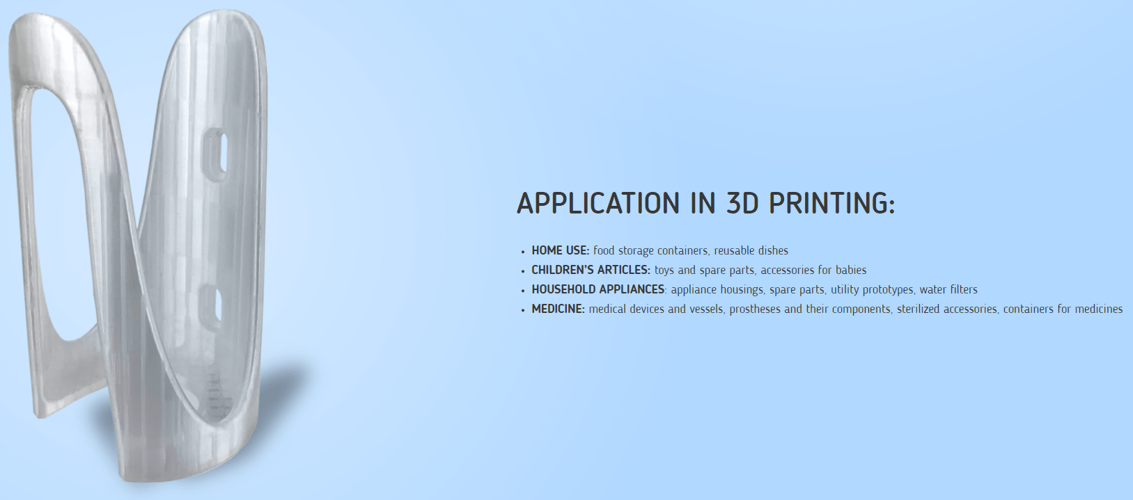 Como material de impressão 3D, os CPE são altamente duráveis, criando impressões com alta resistência e grande detalhe. A sua aderência entre camadas é excelente com um mínimo de deformação e retracção. O CPE tem uma vasta gama de aplicações possíveis devido a ser aprovado pela FDA , sendo inodoro e isento de BPA, BPS e estireno e pode ser utilizado para criar peças em contacto com alimentos, para embalagens nas indústrias alimentar e médica.