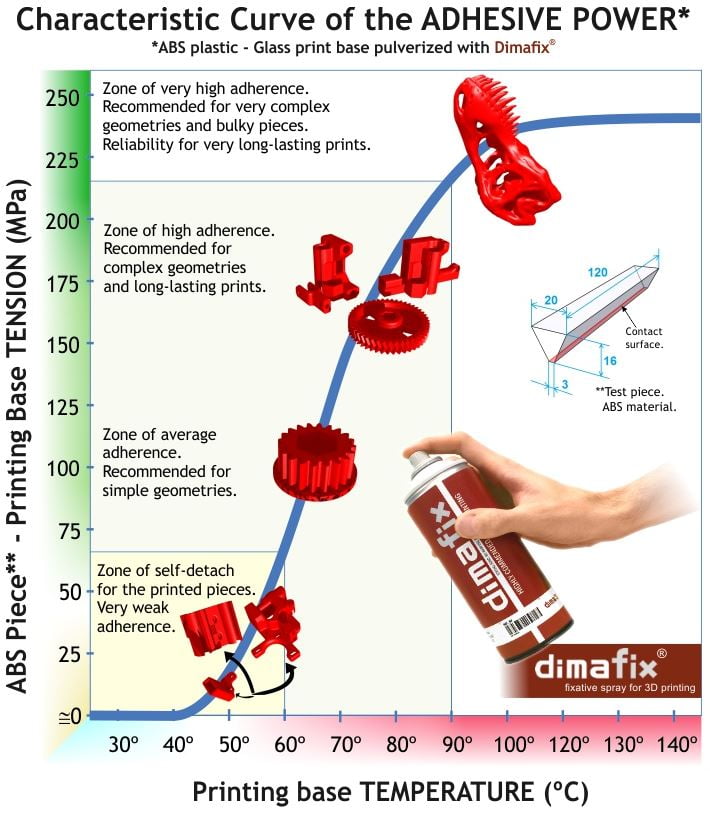 À medida que a temperatura da base de impressão aumenta, a aderência de Dimafix® aumenta.
