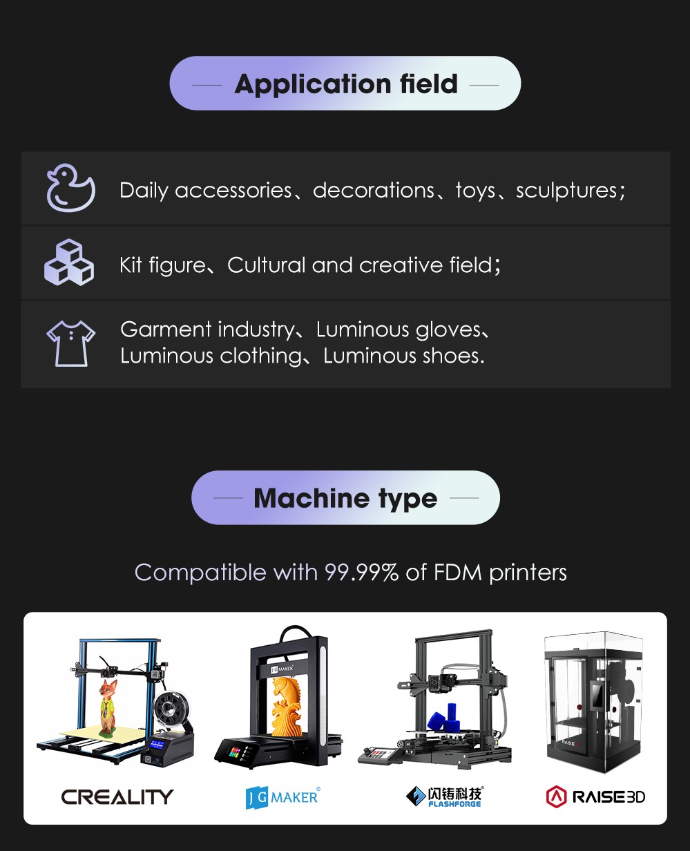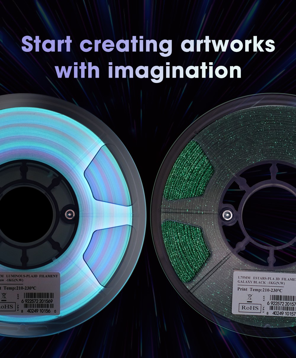▶ O filamento PLA “Glow-in-the-dark Rainbow” e o filamento PLA “Stars” são modificados com base no PLA, que é mais fácil de imprimir do que o ABS, não requer uma câmara de temperatura constante, pode imprimir grandes objectos sem empenar e imprime suavemente sem entupir.