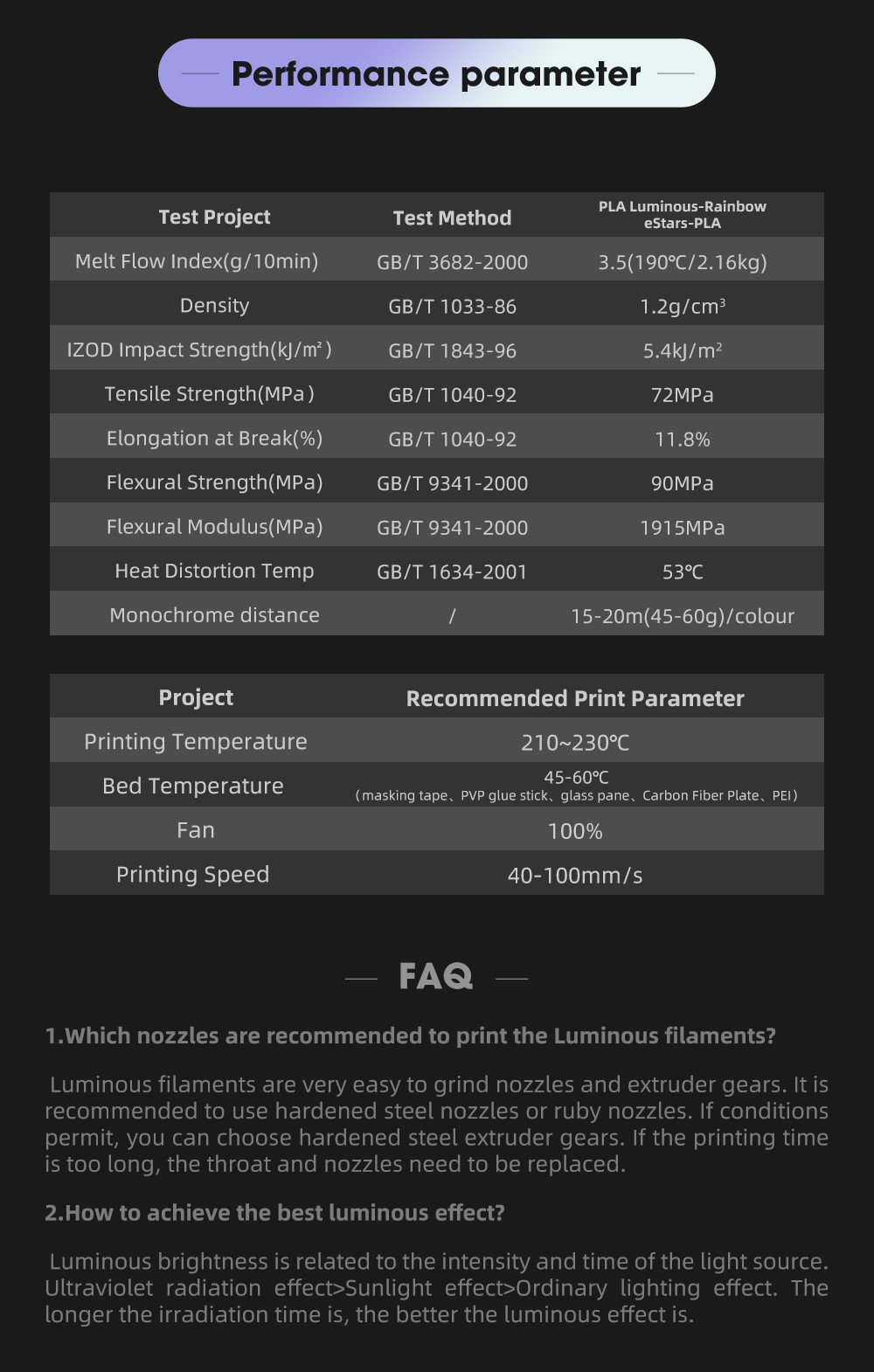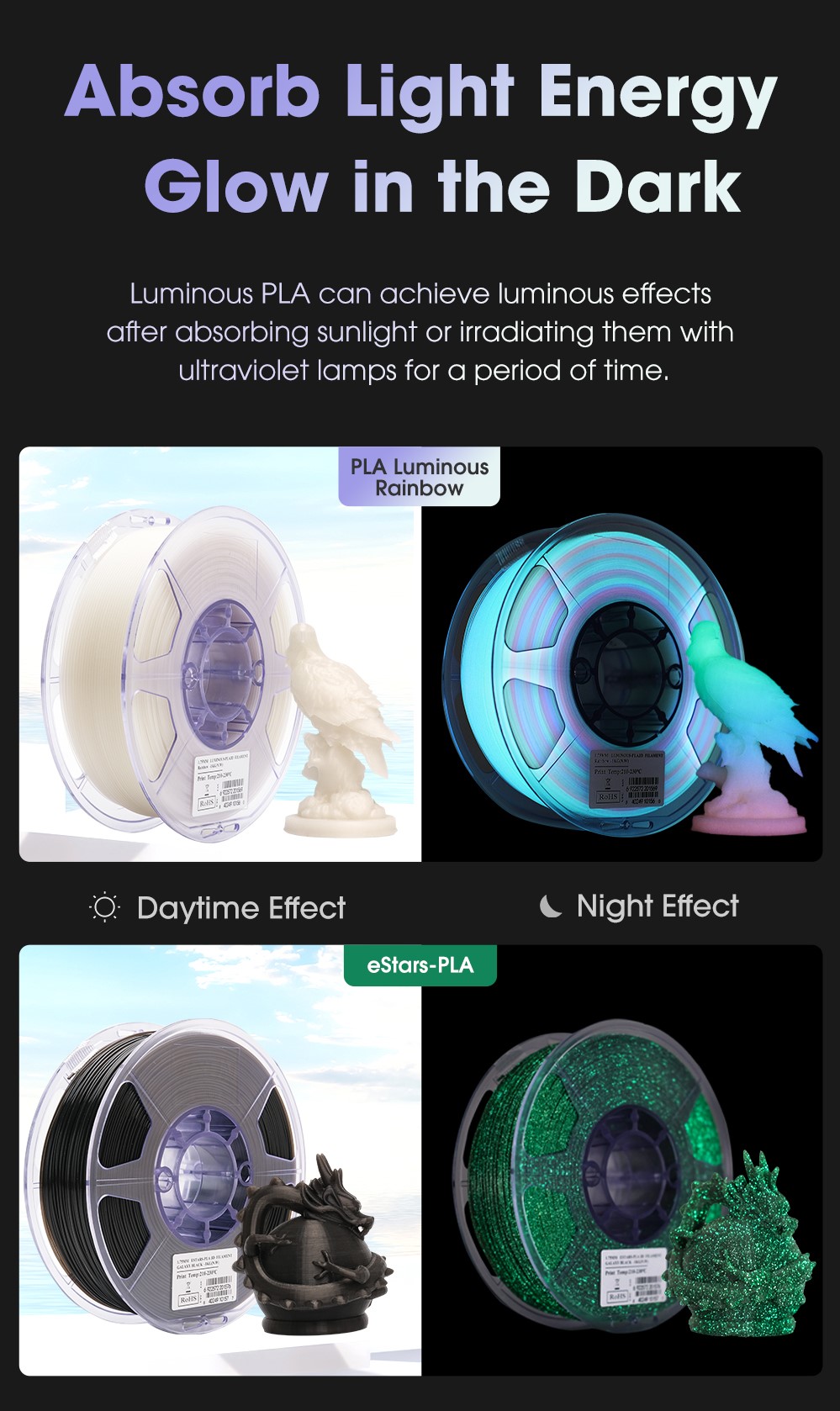 Brilha no Escuro – PLA Luminous-Rainbow e eStars-PLA podem brilhar no escuro depois de absorver a luz do solmostrando um aspecto do arco-íris ou céu estrelado, que é muito romântico. O brilho luminoso está relacionado com a intensidade e o tempo da fonte de luz, e o efeito da fonte de luz ultravioleta é melhor do que a luz solar directa.