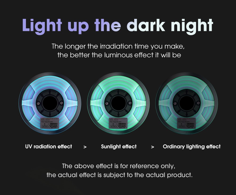 ▶ O filamento incandescente no escuro é adicionado com pó luminoso colorido com base em PLA, que pode mostrar a cor luminosa com gradiente colorido e a cor da luz estelar após absorção da luz ou irradiação com lâmpada ultravioleta;