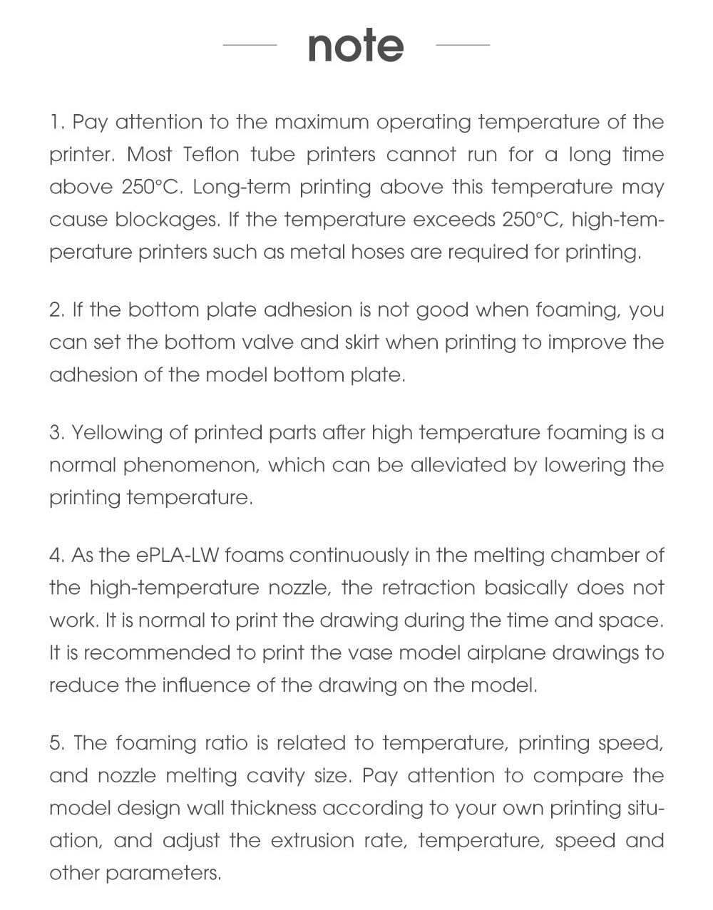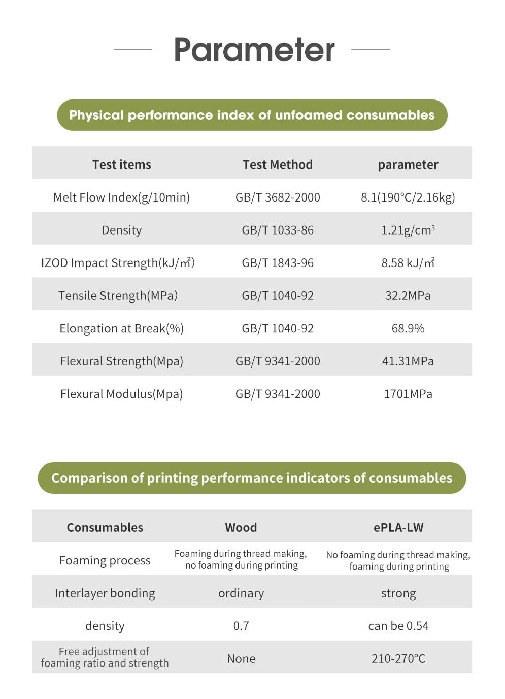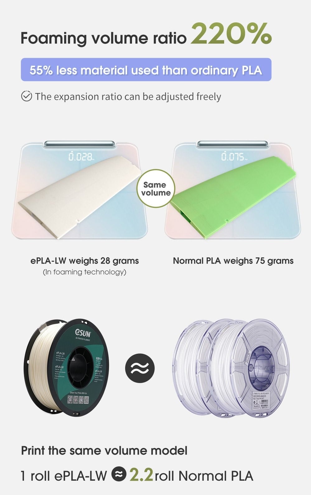 A relação do volume de espuma é de 220%, e 1 rolo de ePLA-LW é equivalente a 2.2 rolos de PLA comum