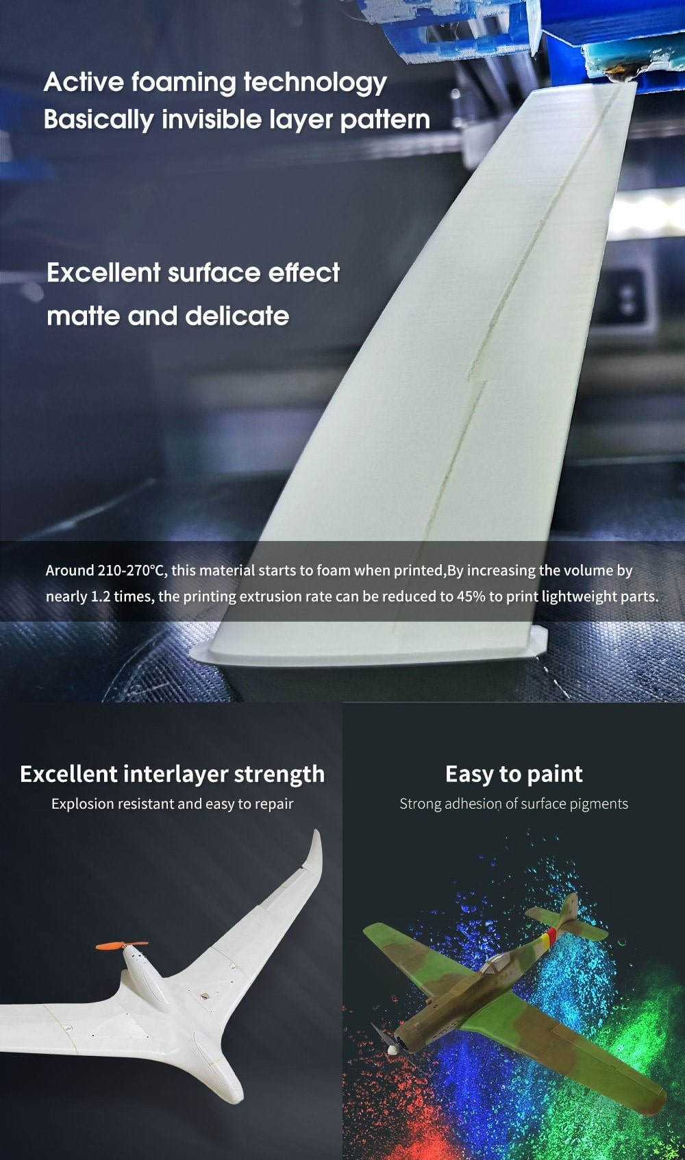 Aplicação – Tecnologia de espuma activa é utilizada para realizar peças PLA leves e de baixa densidade, especialmente concebidas para os campos dos aviões modelo, drones e COSPLAY.