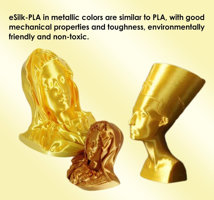 O PLA eSilk adiciona um efeito suave, liso e brilhante como seda real, sem polimento extra necessário, impressão em um detalhe elevado resulta em um belo acabamento.