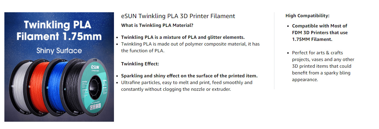 O PLA eTwinkling contem partículas de glitter dando um efeito brilhante na superfície do item impresso.