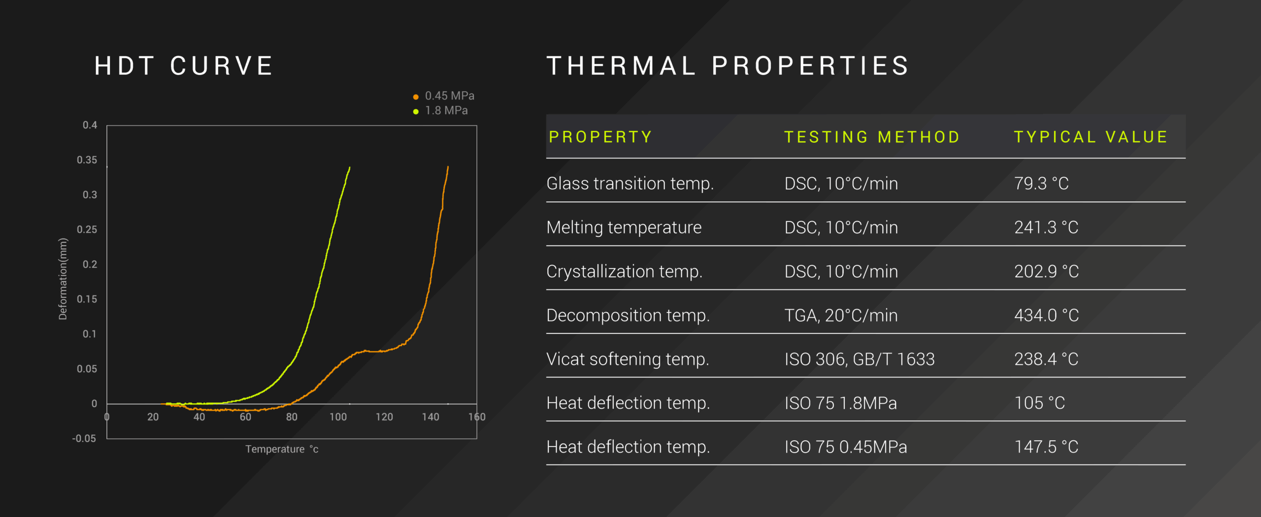 O recozimento melhora significativamente a resistência térmica do PET-CF17, elevando a temperatura de deflexão térmica (HDT) de cerca de 70 °C para mais de 100 °C.