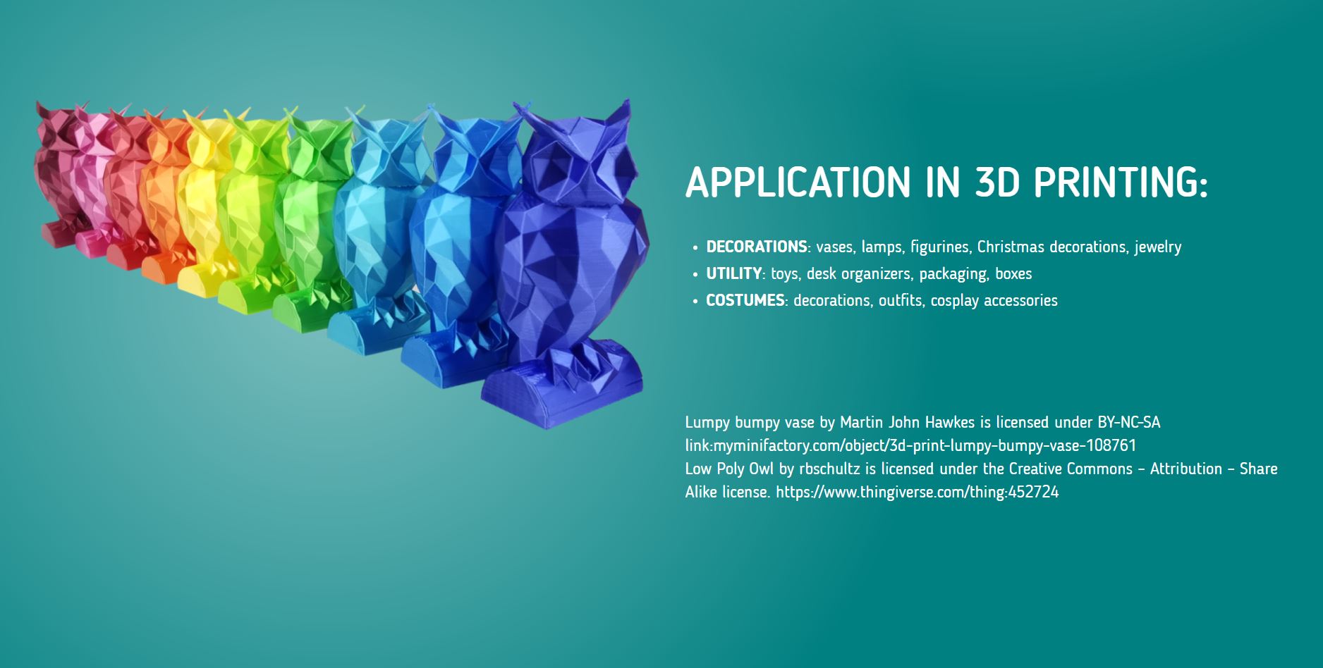 Este filamento é recomendado para a produção de vários elementos decorativos que não precisem de acabamento final ou pintura, tais como vasos, estatuetas, acessórios de cosplay, etc.