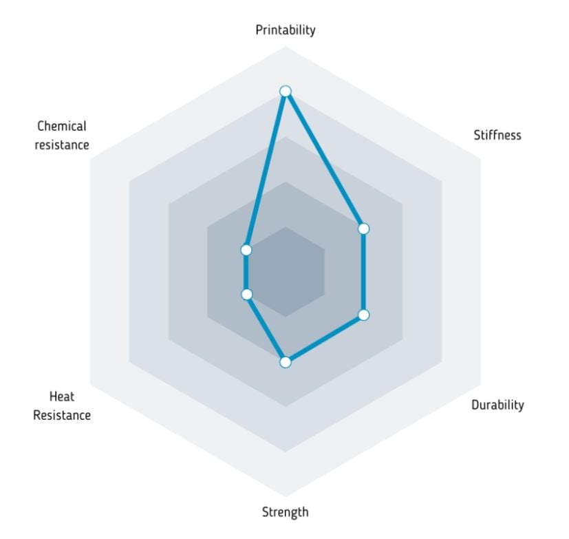 O filamento PLA é um polímero estável, permanente e inodoro. Como contrapartida do PLA em relação ao ABS cabe mencionar que a sua temperatura de amolecimento é de 60ºC em relação aos 100ºC do ABS.