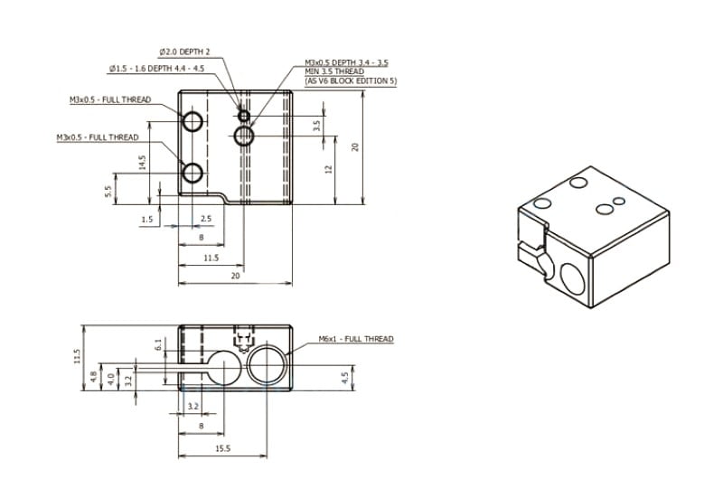 Heat Block Volcano Clone Alumínio 20X20X11.6 ( Heatblock bloco de aquecimento compatível com E3D Volcano clone) – AIMSOAR