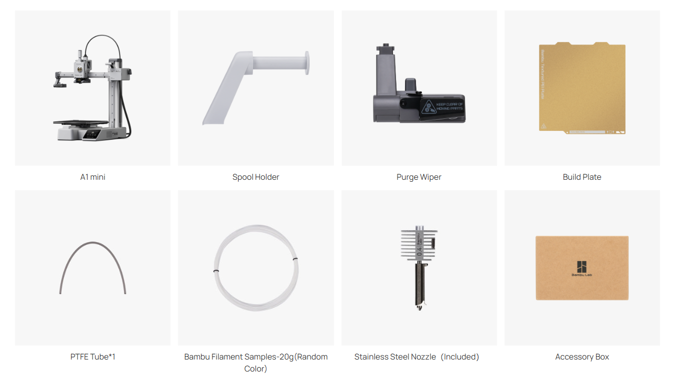 | Dimensões físicas | A1 mini: 347 * 315 * 365 mm ³ , Tamanho da embalagem: 347 * 315 * 365 mm ³, Peso líquido 5,5 kg, Peso bruto 8,2 kg A1 mini Combo: tamanho da embalagem 385 * 430 * 495 mm ³, peso bruto ( Lite AMS incluído ) 10,2 kg |