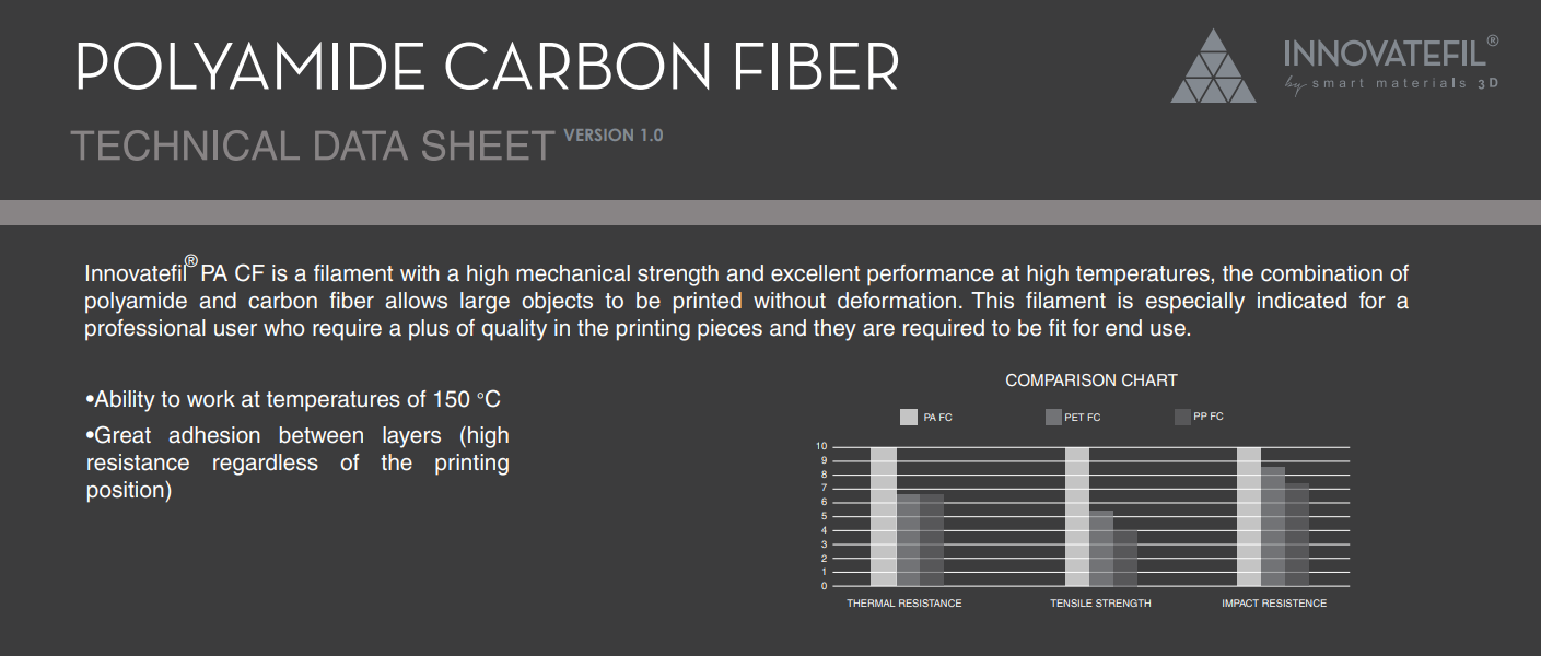 INNOVATEFIL PA CF é um filamento com alta resistência mecânica e excelente desempenho a altas temperaturas. A combinação de poliamida e fibra de carbono permite que objetos grandes sejam impressos sem deformação.