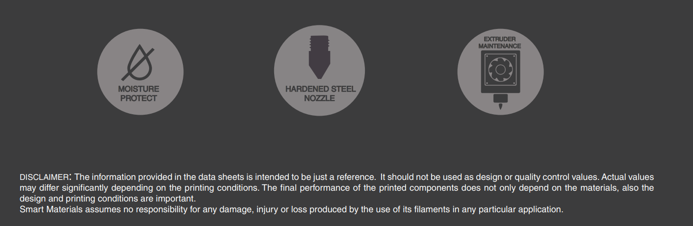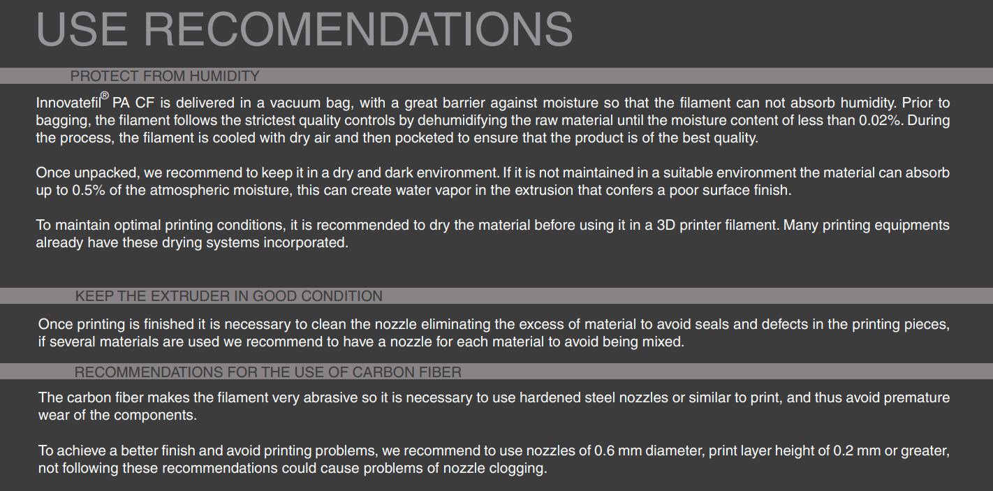 A fibra de carbono torna o filamento muito abrasivo, por isso é necessário utilizar nozzles de aço endurecido ou similares, evitando assim o desgaste prematuro dos componentes.