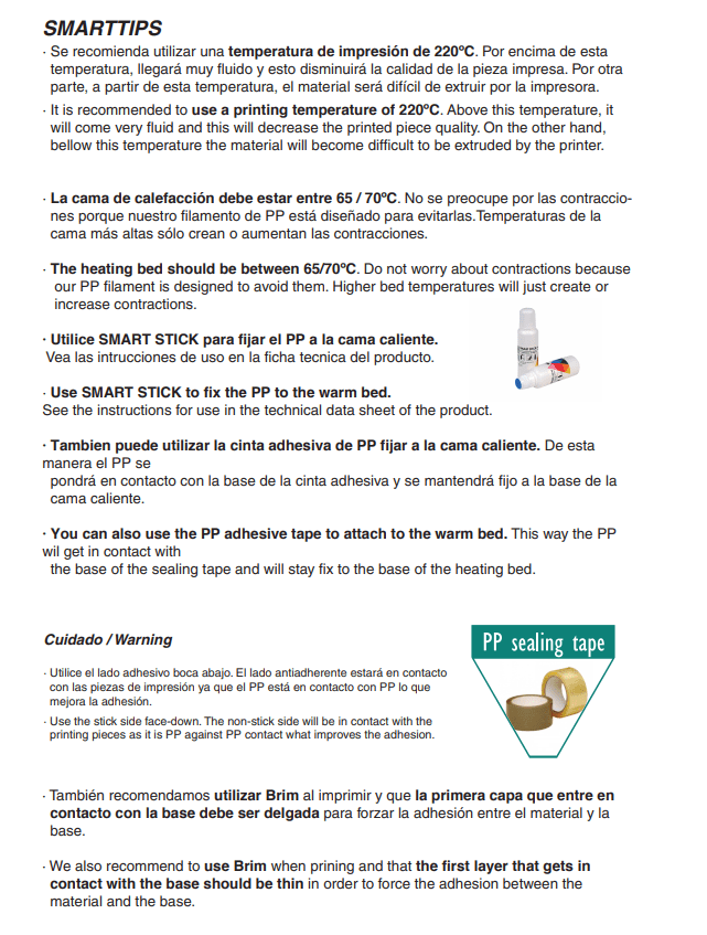 Este material é considerado de difícil aderência à superfície da plataforma de impressão 3D de vidro ou PEI. Para evitar problemas de warpping e de aderência das peças, recomendamos a aplicar potenciador de aderência especial para PP.