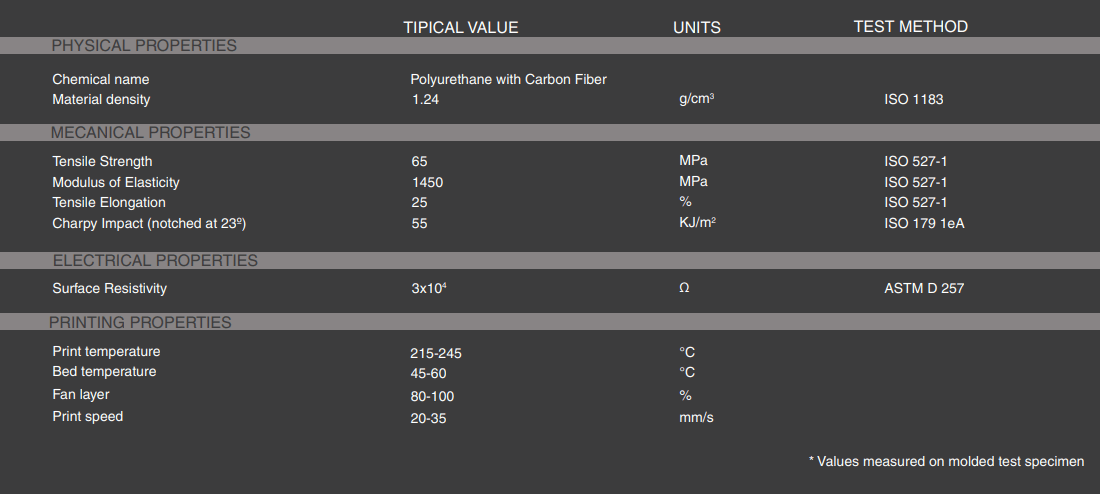 A incorporação de fibras de carbono oferece propriedades melhoradas, alta resistência à tracção, alta tolerância ao calor e maior resistência química em comparação com TPUs não reforçadas.