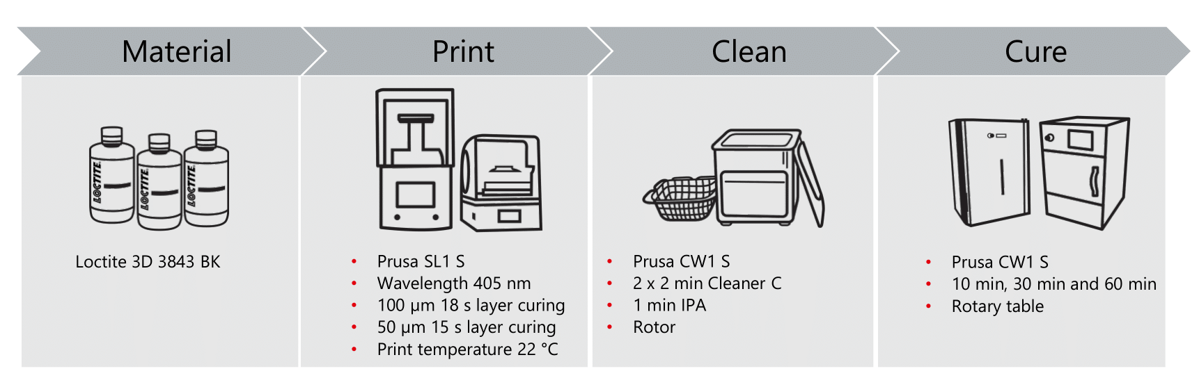 Depois de um processo de validação exaustivo da empresa Henkel em conjunto com a Prusa Research, apresentamos-lhe a resina Loctite 3D 3843 HDT60 High Toughness. Validámos não só que pode imprimir esta resina avançada na Prusa SL1S SPEED original, mas também que, ao seguir o fluxo de trabalho específico de pós-processamento, pode confiar nas propriedades mecânicas da impressão definidas pelo fabricante.