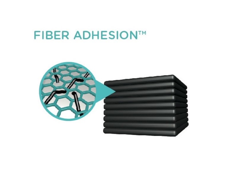 A tecnologia da fibra Adhesion™ melhora a adesão de camadas de materiais reforçados com fibras, optimizando a química da superfície das fibras para conseguir uma melhor dispersão e ligação à matriz. Isto resulta numa melhor resistência ao longo do eixo Z e na redução da anisotropia mecânica.