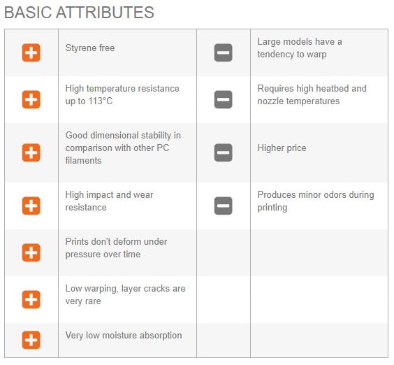 A composição do policarbonato puro é um material não adequado para a impressão 3D. Adere muito mal à plataforma de impressão e devido à sua alta expansão térmica, tem tendência a deformar-se e a rachar (layer cracking). Neste filamento, a Prusament adicionou aditivos cuidadosamente seleccionados, melhorando a adesão e reduzindo o fenómeno de layer cracking e a deformação, mantendo ao mesmo tempo as excelentes propriedades do policarbonato.
