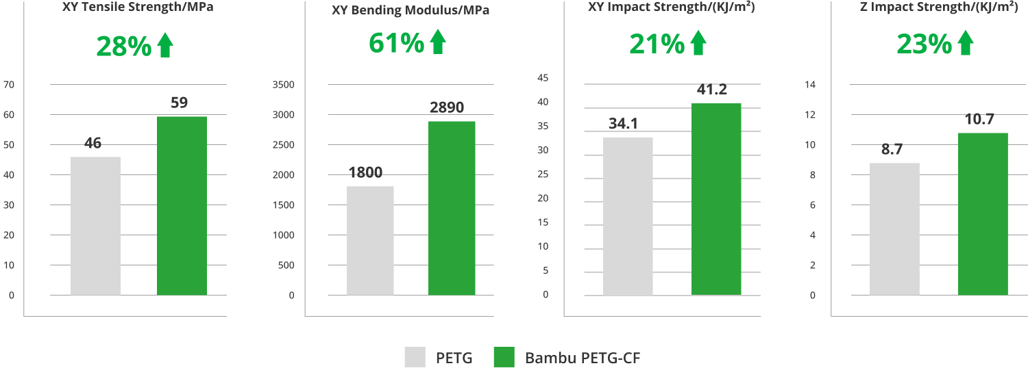 A adição de fibra de carbono também aumenta significativamente a resistência XY do PETG sem sacrificar a ligação das camadas.