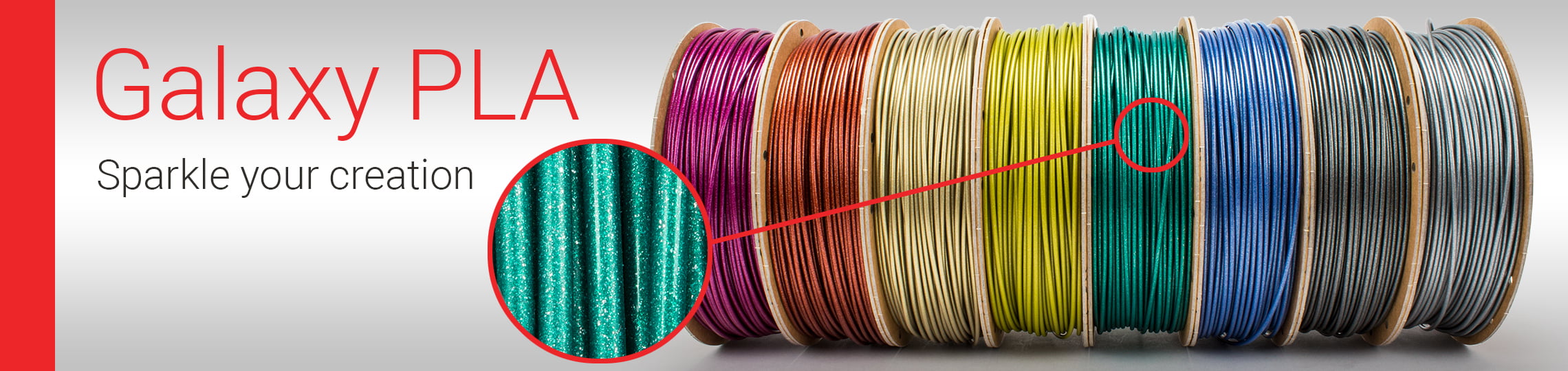 Galaxy PLA is a deep metallic coloured PLA range – based on our EasyFil PLA compound – with an incredibly high amount of silver aluminium-flakes added. The high added aluminium-flake content gives a beautiful sparkling, reflecting and glittering finish to Galaxy PLA printed objects.