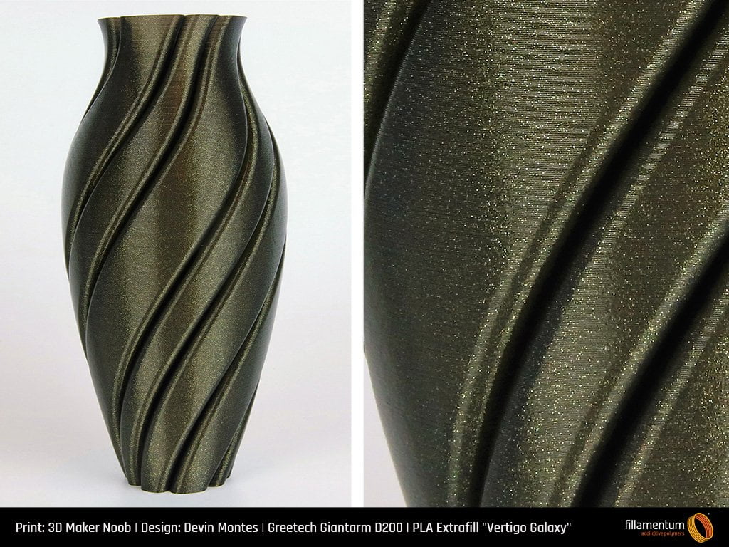 O filamento PLA Premium “Vertigo Galaxy” (1,75mm ou 2,85 m) é um filamento de alta qualidade fabricado na Europa para impressão 3D sob o nome comercial PLA Extrafill “Vertigo Galaxy” da Fillamentum. É conhecido pelo brilho incorporado no filamento que dá uma aparência brilhante em áreas com cores esverdeadas. Ao incorporar este brilho, o Vertigo Galaxy permite que você esconda as alturas da camada de peças impressas.