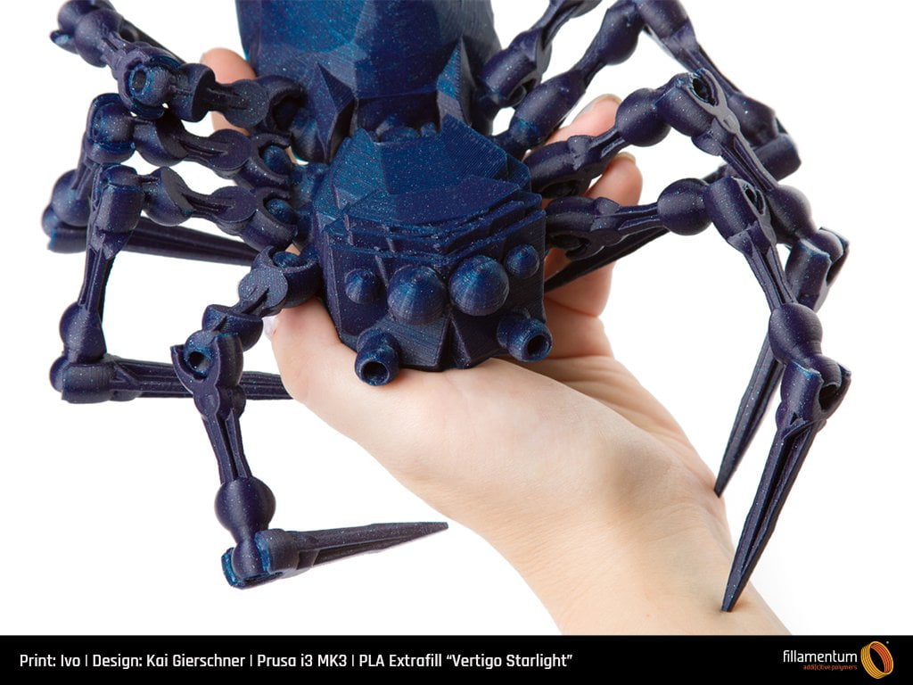 O filamento PLA Premium “Vertigo Starlight” (1,75mm ou 2,85 m) é um filamento de alta qualidade fabricado na Europa para impressão 3D sob o nome comercial PLA Extrafill “Vertigo Starlight” da Fillamentum. É conhecido pelo brilho incorporado no filamento que dá uma aparência brilhante em áreas com cores azuis. Ao incorporar este brilho, o Vertigo Starlight permite que você esconda as alturas da camada de peças impressas.