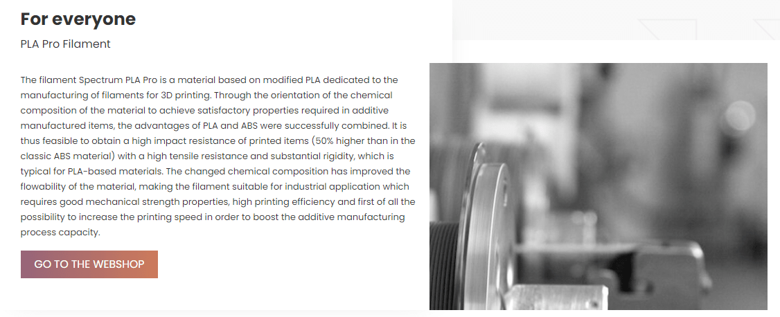 Através de uma alteração da composição química do PLA Pro com o filamento ABS, foi possível obter uma combinação com sucesso. Permitindo assim que os objectos impressos em 3D com o filamento PLA Pro estejam capacitados com uma alta resistência ao impacto (50% superior ao ABS clássico).