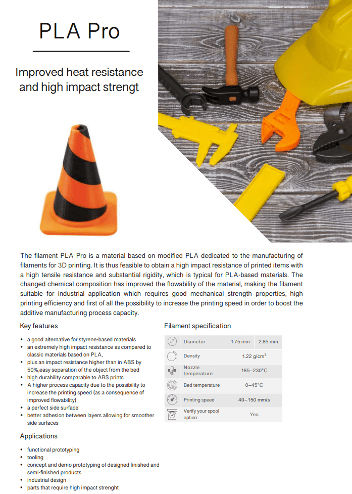 O filamento PLA PRO, já é uma referência devido à sua excelente capacidade de utilização em objectos que exigem alta resistência ao impacto e alta precisão dimensional, combinado com o processo de encolhimento do objecto (após arrefecer) praticamente nulo. Dentro dos exemplos de aplicações do PLA Pro encontram-se todos os tipos de produção de objetos, seja de proteções, para-choques e outros itens de utilização semelhante (incluindo tamanhos grandes).