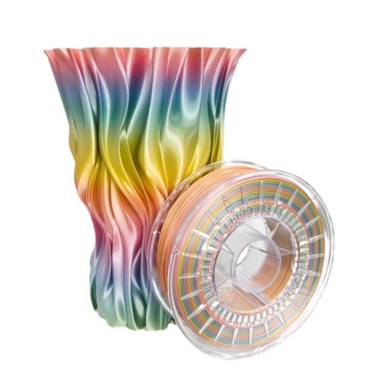 O PLA Rainbow Silk é um filamento à base de polilactida enriquecido com uma mistura única de materiais.