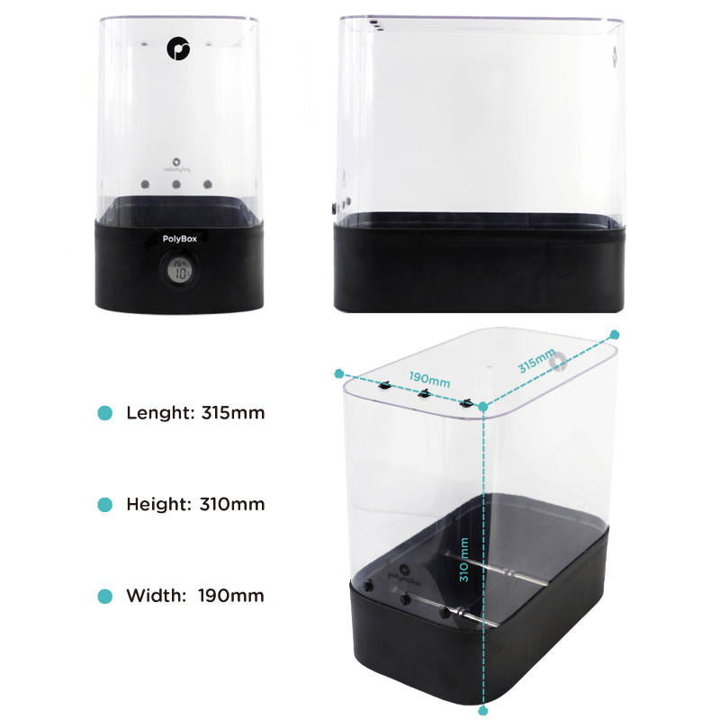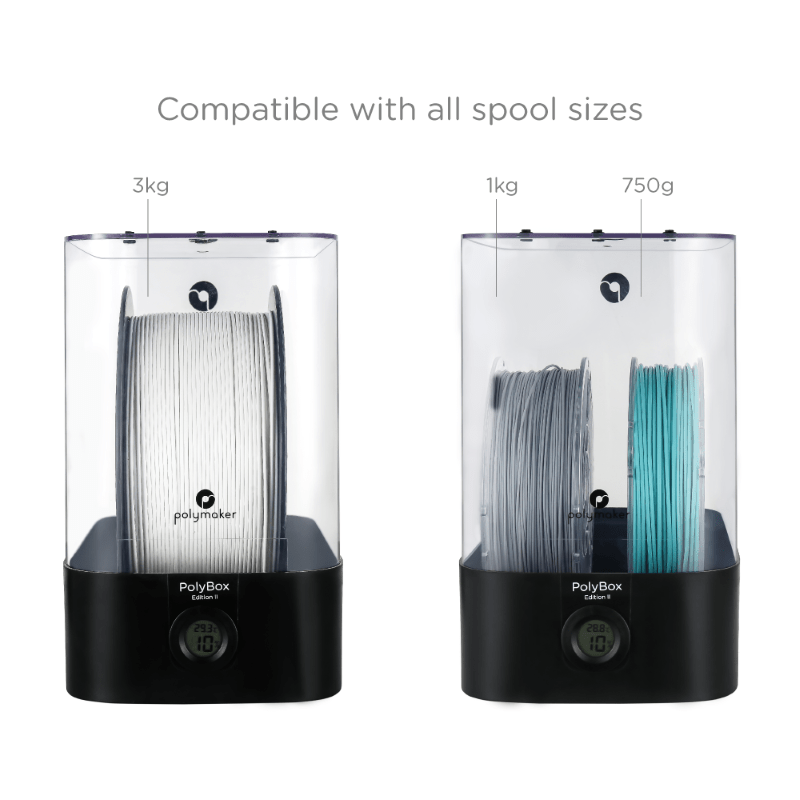 A humidade é regulada por grandes sacos dessecantes que absorvem a humidade do ar dentro da PolyBox, que é especialmente concebida para materiais higroscópicos tais como PolySmooth, PVA ou nylon. A PolyBox pode conter duas bobinas de 1 kg simultaneamente ou uma de 3 kg e é compatível com diâmetros de filamento de 1,75 e 2,85 mm.