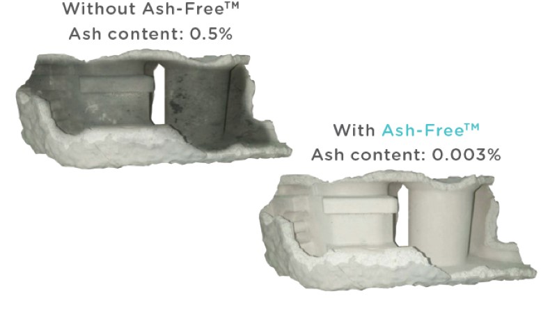 A tecnologia Ash-Free™ permite que o filamento da Polymaker, que foi concebido para fundição por investimento, queime de forma limpa sem qualquer resíduo, permitindo peças metálicas sem defeitos. A impressão em 3D tem sido usada para produzir padrões de fundição por investimento, uma vez que reduz tanto o custo como o tempo de produção de pequenos volumes.