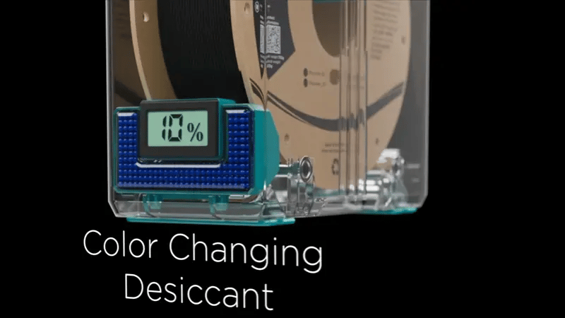 - Dessecante Colorido: Monitoriza o ambiente dos filamentos com um dessecante que muda de cor, simplificando a manutenção.
