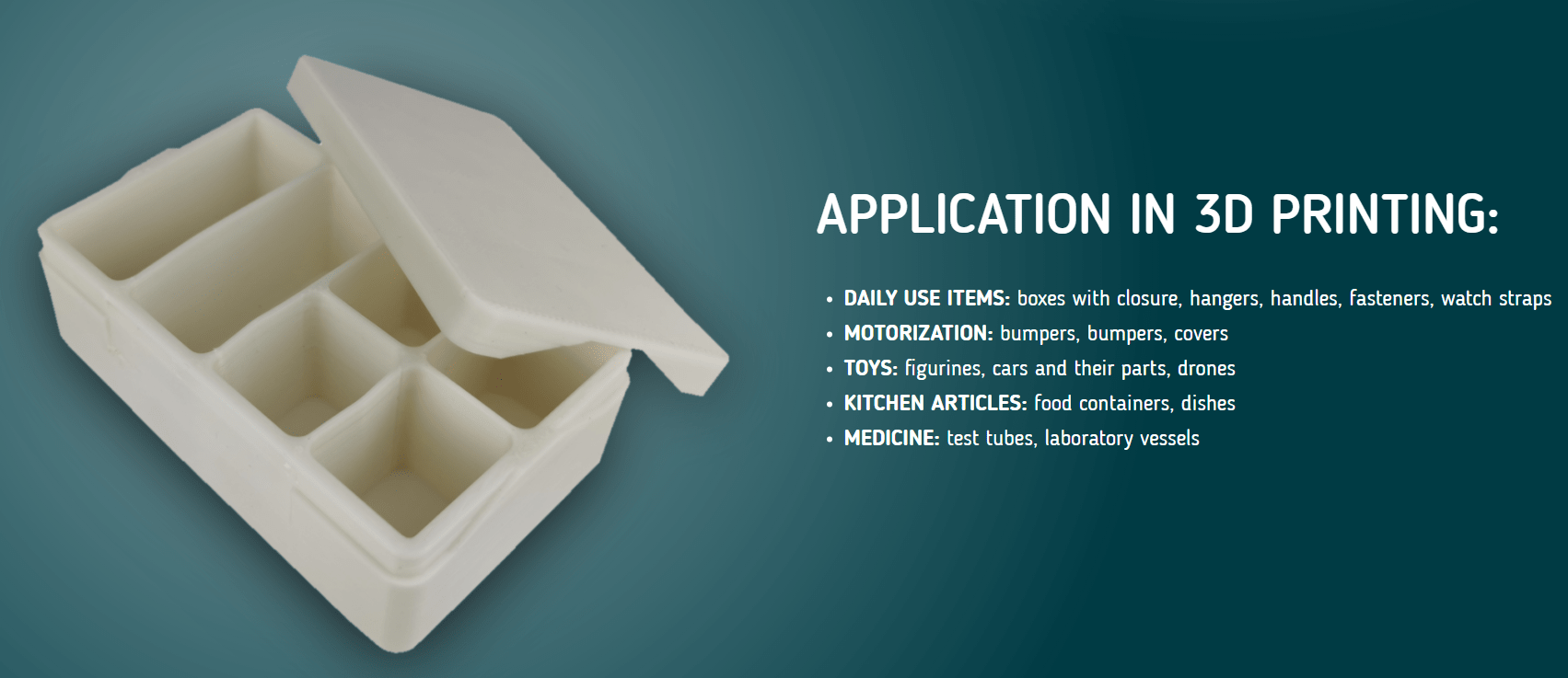 O polipropileno (PP) é um dos polímeros mais utilizados na indústria. A sua elevada flexibilidade, durabilidade incrível, baixo peso e resistência aos produtos químicos fizeram com que encontrasse inúmeras aplicações da medicina, passando pela indústria automóvel para a indústria de embalagens. O filamento PP de fibra de vidro aproveitou o potencial deste material incrível e tornou possível a utilização na impressão 3D.