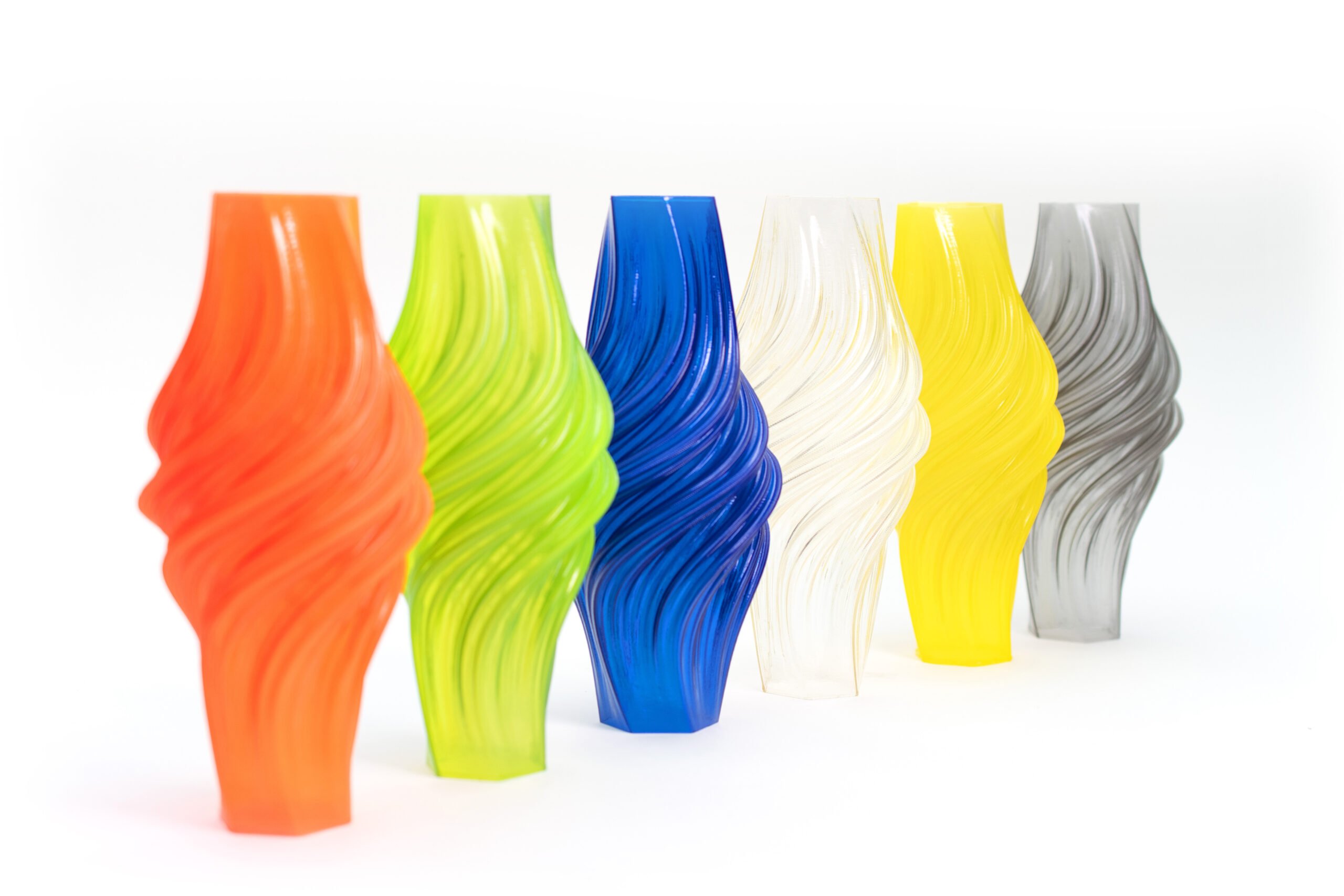 Cada amostra representa uma cor – Prusa Orange Transparent, Bright Green Transparent, Dark Blue Transparent, Light Yellow Transparent, Natural Transparent e Smoky Black Transparent.