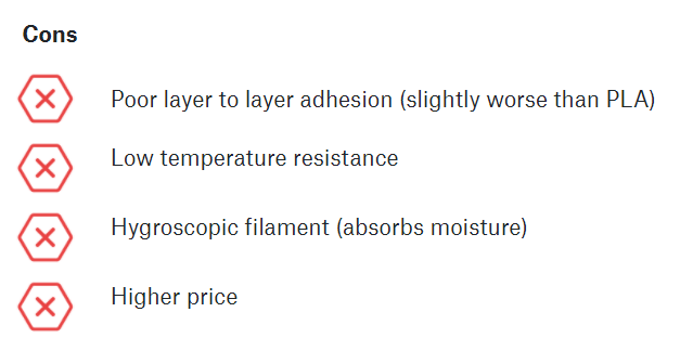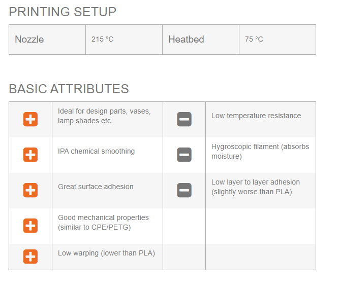 Os parâmetros de impressão são semelhantes ao PLA, as propriedades mecânicas são ligeiramente melhores (semelhantes ao CPE ou PETG).