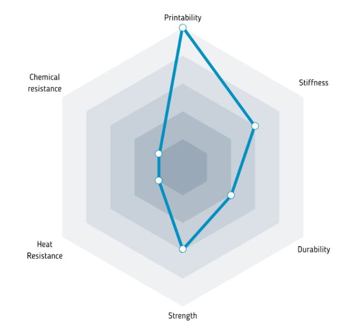 O filamento PLA é um polmero estável, permanente e inodoro. Como contrapartida do PLA em frente ao ABS cabe mencionar que a sua temperatura de amolecimento é de 60ºC em frente aos 100ºC do ABS .