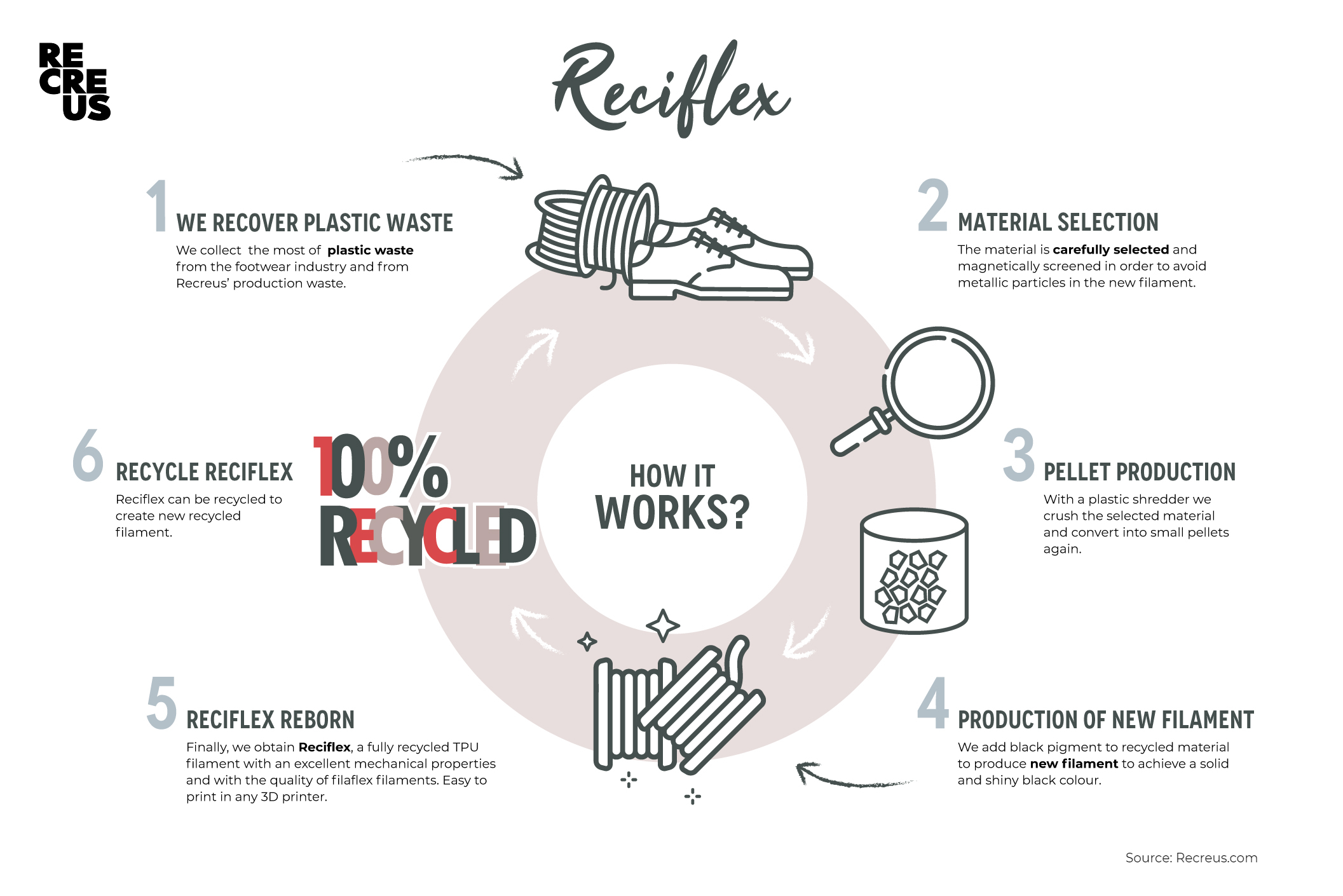 Reciflex é o novo filamento TPU flexível, 100% de origem reciclada, tanto de resíduos da indústria do calçado como da produção interna da Recreus.