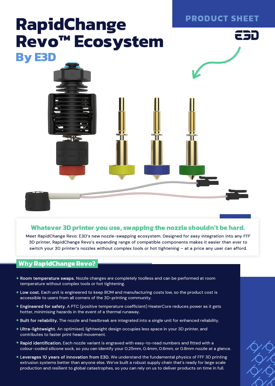 Descubra os nossos nozzles Revo para o seu sistema de extrusão de impressão 3D, a partir de E3D. Para trocas de nozzles sem complicações, sem a necessidade de ferramentas ou aperto a quente.
