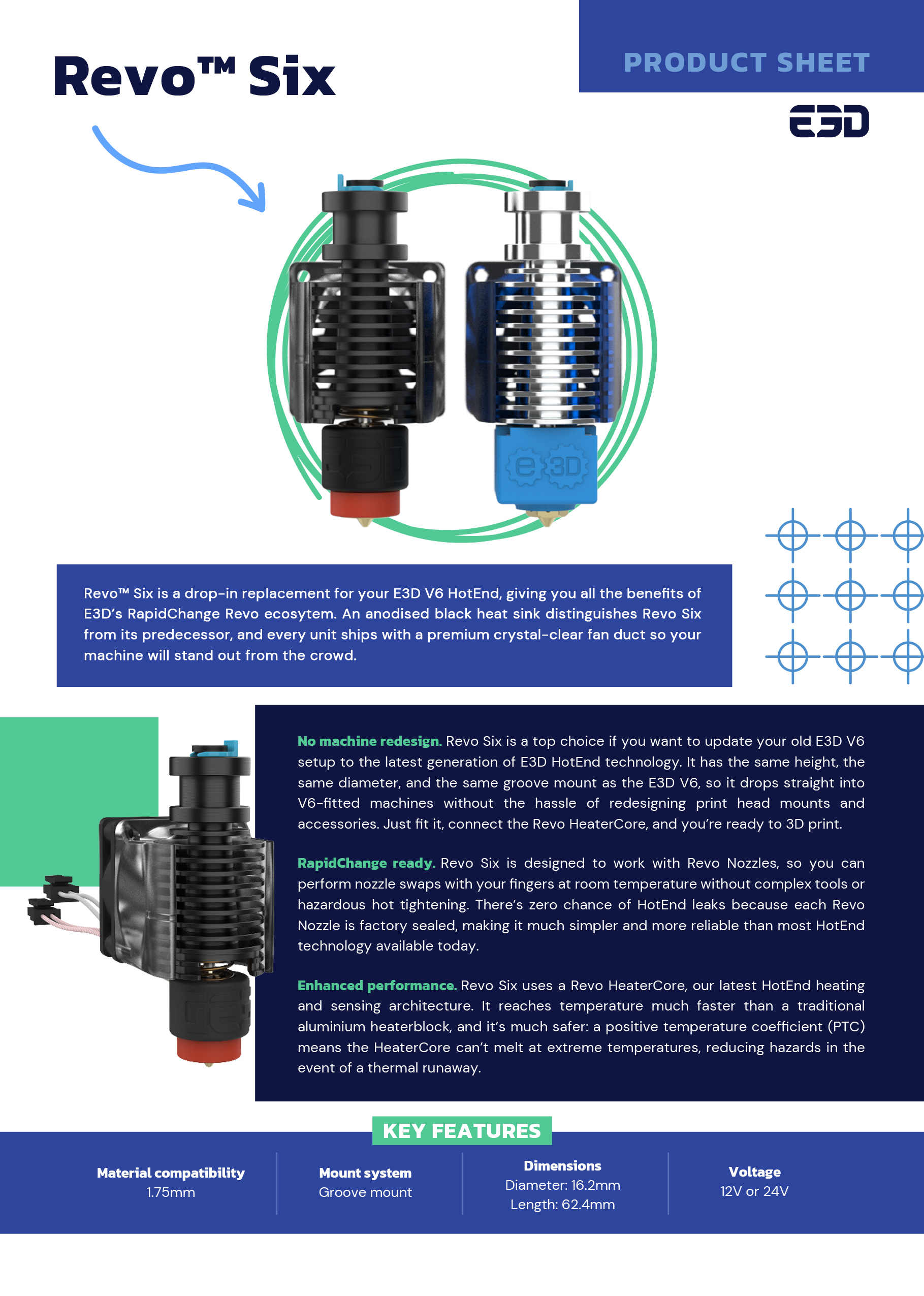 O Revo Six Hotend é um substituto direto do seu E3D V6 Hotend e oferece-lhe todas as vantagens do sistema E3D RapidChange Revo.