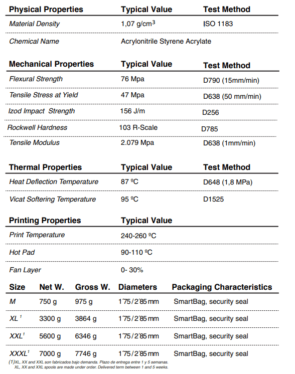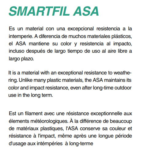 O ASA é um filamento frequentemente utilizado para telhados domésticos, coberturas de equipamento de transporte, maquinaria de exterior e equipamento eléctrico quando é necessária uma resistência persistente à cor e ao impacto.