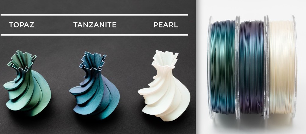 PLA filamento com efeito IRIDESCENT que permite apreciar uma mudança de cor de acordo com o ângulo de visão e a fonte de luz, de modo a obter tons inovadores e elegantes.